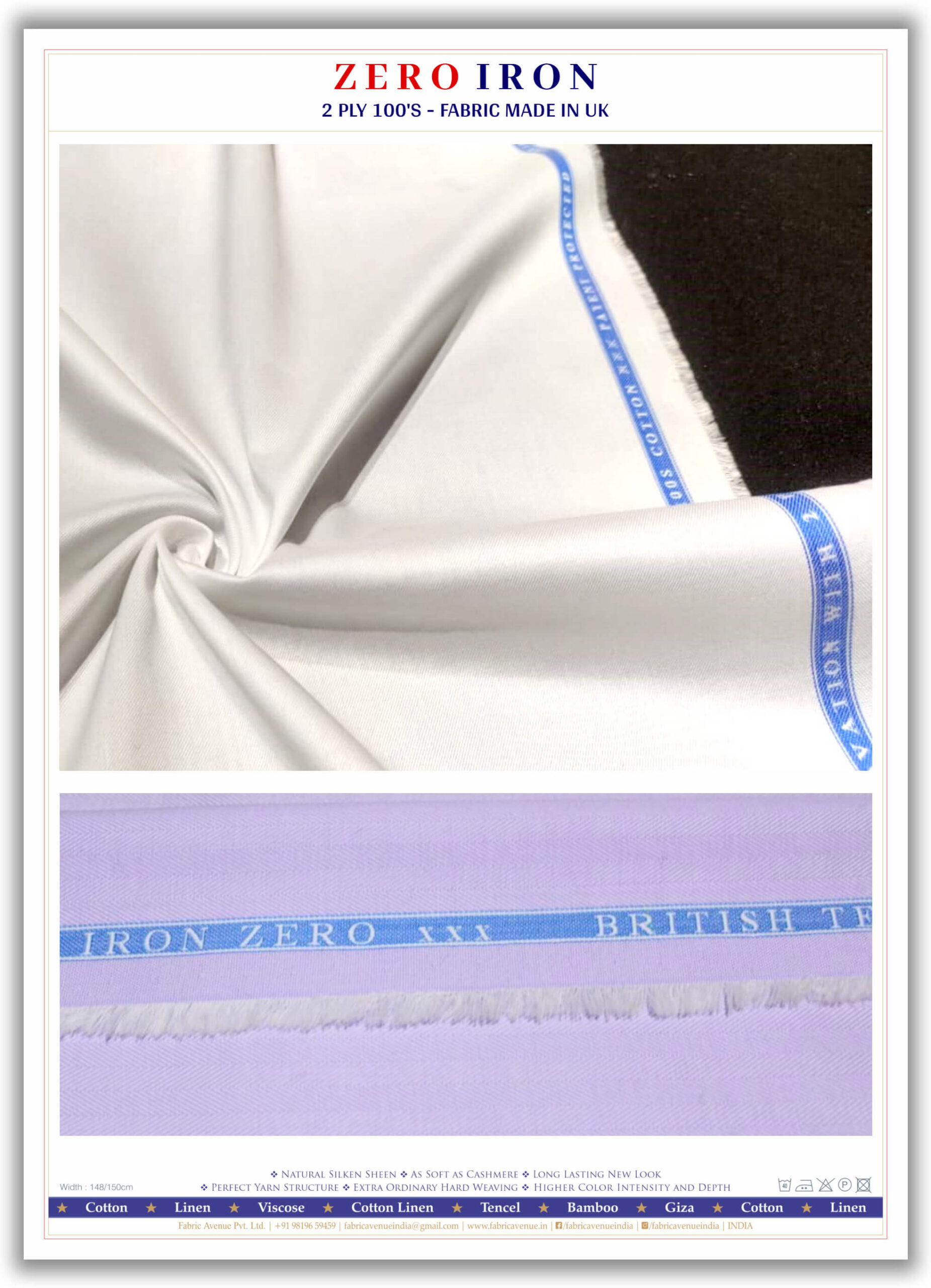 Iron Zero is a fine Winkle Resistant Giza Cotton fabric. The unique treatment at the fibre level, not just at the surface discourages the Cotton Shirts made out of this fabric generating stubborn wrinkles. Also this treatment swells up the Cotton molecules, so the Cotton Shirts remain wrinkle free naturally and gets a soft and Silky feel too.